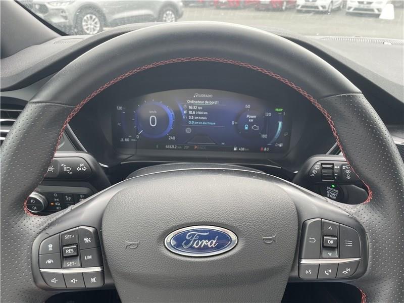2 Fixations ISOFIX aux places AR|3ème appui-tête AR|5 ceintures de sécurité 3 points|Aide au démarrage en côte|Aide au maintien dans la voie avec avertisseur de franchissement de ligne|Aide au stationnement AV/AR|Airbags frontaux, latéraux (thorax) et rideaux|Air conditionné automatique bizone|Allumage automatique des essuie-glaces|Badge ST-Line|Banquette AR coulissante rabattable (60/40) avec accoudoir central et porte gobelet|Barres de toit Noir|Becquet couleur carrosserie|Bouton de démarrage "Ford Power"|Caméra AR 180°|Combiné d'instrumentalisation numérique 12.3" avec Ecomode|Console centrale avec accoudoir avec 2 prises USB|Contours de vitres noirs|Correcteur électronique de trajectoire (ESP) avec optimisation du freinage électronique|Crochet d'attelage amovible|Désactivation de l'airbag passager|Déverrouillage électrique du hayon|Disques de frein AR|Double sortie d'échappement ST-Line|Eclairage compartiment coffre|Eclairage d'ambiance intérieur|Environnement noir|Feux de route intelligents - Commutation automatique des feux de route aux feux de croisement|FordPass Connect avec modem embarqué 4 et fonction eCall|Frein de stationnement électrique|Grille de calandre noire mate ST-Line|Hayon mains libres|Jantes alliage 18" 5x2 branches finition St-Line avec pneus 225/60 R18|Kit Carrosserie ST-Line|Kit de réparation des pneumatiques|Pack Assistance|Peinture métallisée Fashion Gris Magnetic|Phares antibrouillard AV LED|Phares LED Reflecteurs avec feux AR à LED|Plancher de coffre ajustable|Prise 12V dans le coffre|Régulateur de vitesse|Rétroviseur intérieur électrochrome|Rétroviseurs extérieurs couleur carrosserie électriques, chauffants et rabattables avec éclairage d'approche|Sécurité enfant avec verrouillage électrique des portes AR|Sellerie Mixte tissu noir Rapton avec renforts latéraux Sensico Salerno|Siège conducteur réglable électriquement 10 positions|Siège passager réglable en hauteur avec soutien lombaire (8 positions)|Sièges sport|Suspension ST-Line|Système audio B&O bi-tuner AM/FM Ford SYNC4, avec écran tactile 8", DAB, commandes vocales 2 ports USB, compatible AppLink, Apple CarPlay et Android auto, 10 HP|Système d'avertissement acoustique (AVAS - Alerte sonore pour piétons)|Système de navigation Europe et points d'intérêts Michelin|Système de prévention de collision avec détection de piétons|Système de surveillance de la pression des pneus|Système KeyFree avec ouverture et démarrage sans clé|Système MyKey (seconde clé programmable)|Tapis de sol AV et AR ST-Line avec surpiqûres rouges|Trappe Easy Fuel|Verrouillage centralisé à distance|Vitres AR surteintées|Vitres AV et AR électriques|Volant à méplat 3 branches Sensico ST-Line avec surpiqûres rouges