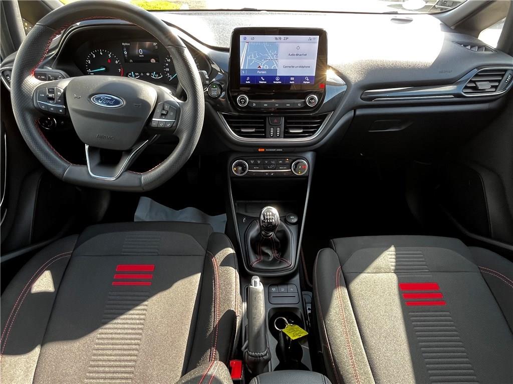 2 Fixations ISOFIX aux places AR|3ème appui-tête AR|5 ceintures de sécurité 3 points|Aide au démarrage en côte|Aide au maintien dans la voie|Aide au stationnement AR|Airbags frontaux, latéraux (thorax) et rideaux|Air conditionné automatique|Alerte de baisse de vigilance du conducteur|Alerte de ceinture de sécurité AV/AR|Alerte de franchissement involontaire de ligne|Allumage automatique des essuie-glaces|Allumage automatique des phares et des feux de route|Badge spécifique ST-Line sur les ailes AV|Banquette rabattable 60/40|Becquet AR couleur carrosserie|Caméra de recul|Ciel de toit noir|Console centrale avec accoudoir|Désactivation de l'airbag passager|Direction assistée électrique|Eclairage d'ambiance intérieur|Entourage des vitres noires|ESP|Feux AR à LED|FordPass Connect avec modem embarqué - Abonnement gratuit pendant 10 ans|Grille de calandre ST-Line|Jantes alliage 17" Rock Metallic avec pneus 205/45 R17|Kit carrosserie (Pare-chocs AV/AR et bas de caisse spécifiques ST-Line)|Kit de réparation des pneumatiques|Limiteur et régulateur de vitesse|Ordinateur de bord couleur 4.2"|Pack Hiver|Peinture métallisée Bleu Azur|Phares AV à LED avec antibrouillards intégrés|Poignées de portes couleur carrosserie|Recharge de telephone par induction|Reconnaissance des panneaux de signalisation|Rétroviseur électrochromique|Rétroviseurs extérieurs couleur carrosserie rabattables manuellement|Sellerie Tissu Noir Eton avec renforts latéraux Eton et surpiqûres rouges|Siège conducteur à réglage manuel 4 positions|Siège passager AV à réglage 4 positions|Sortie d'echappement chromée|Suspension Sport|Système audio Ford SYNC avec Navigaion, écran tactile 8", 2 ports USB, DAB, 6HP,|Système d'alerte à la conduite à contre-sens|Système de surveillance de la pression des pneus|Système KeyFree - d'entrée et de démarrage mains libres|Système MyKey (seconde clé programmable)|Tapis de sol AV avec surpiqures rouges|Trappe Easy Fuel|Verrouillage centralisé à distance|Vitres AR surteintées|Vitres AV et AR électriques|Volant en cuir à méplat avec surpiqûres rouges