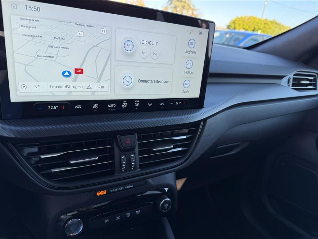 2 ports USB à l'AR (type C)|4 Modes de conduite sélectionnables: Normal, Eco, Sport, Faible adhérence|ABS|Aide au maintien dans la voie|Aide au stationnement AV/AR|Airbags frontaux, latéraux et rideaux|Air conditionné automatique bizone|Alerte de véhicule en approche avec assistance au freinage d'urgence|Allumage automatique des essuie-glaces|Anti démarrage Securilock|Applications décoratives spécifiques ST-Line|Assistance prédictive de limitation de vitesse|Badge ST-Line|Banquette AR ajustable et rabattable 60/40|Barres de toit noires|Bas de caisse sport|Batterie d'hybridation éléctrique|Becquet AR|Boîte automate à fonction continu|Bouclier AR couleur carrosserie|Bouclier AR sport|Bouclier AV Sport|Boucliers AV couleur carrosserie avec crosses de bas de bouclier noires|Caméra AR 180°|Ceinture de caisse ton foncé|Chargeur sans fil|Ciel de toit noir|Console centrale avec accoudoir avec 2 prises USB|Contours de vitres noirs|Coques de rétroviseurs peints couleur carrosserie|Dégivrage électrique du haut pare-brise|Direction assistée|Double sortie d'échapement avec canules d'échappement polies|eCALL (bouton d'appel d'urgence)|Eclairage d'ambiance intérieur|E-Shifter - Sélecteur de vitesse rotatif|ESP|Feux de route intelligents (commutation automatique des feux de route/croisements)|Frein de stationnement électrique|Grille AV finition ST-Line|Grille de bas de bouclier noire|Jantes alliage 18" style ST-Line|Kit de réparation des pneumatiques|Limiteur de vitesse intelligent|Modem 5G|Ordinateur de bord|Panneaux inférieurs de protection de porte couleur carrosserie|Peinture métallisée Gris Solar|Peinture métallisée Vert Bursting|Phares AV avec fonction Follow me home|Phares Full LED avec feux de jour à LED|Plancher de coffre ajustable|Poignée de coffre couleur carrosserie|Poignées de porte couleur carrosserie|Prise 12V dans le coffre|Reconnaissance des panneaux de signalisation|Régulateur de vitesse|Rétroviseur intérieur électrochrome|Rétroviseurs extérieurs électriques chauffants, rabattables électriquement avec éclairage d'approche|Sans accoudoir central AR|Sécurité enfant (verrouillage manuel des portes AR)|Sellerie tissu Mira ST-Line avec surpiqûres rouges|Siège conducteur à réglage manuel sur 8 voies|Siège conducteur et passager avec pôche aumonière|Siège passager à réglage manuel sur 8 voies|Sièges Sport|Surveillance des angles morts avec assistance au remorquage|Suspension AR barre de torsion|Suspensions sport ST-Line|SYNC 4 avec écran 13,2'', 6 HP avec radio DAB, Apple Carplay et Android auto sans fil|Système d'alerte à la conduite à contre-sens|Système de prévention de collision avec détection de piétons|Système de surveillance de la pression des pneus|Système Keyfree avec ouverture des portes AV et démarrage sans clé|Tapis de sol avec logo ST Line|TCS|Toit panoramique ouvrant|Vitres AR surteintées|Vitres AV et AR électriques|Volant à méplat 3 branches Sensico ST-Line avec surpiqûres rouges