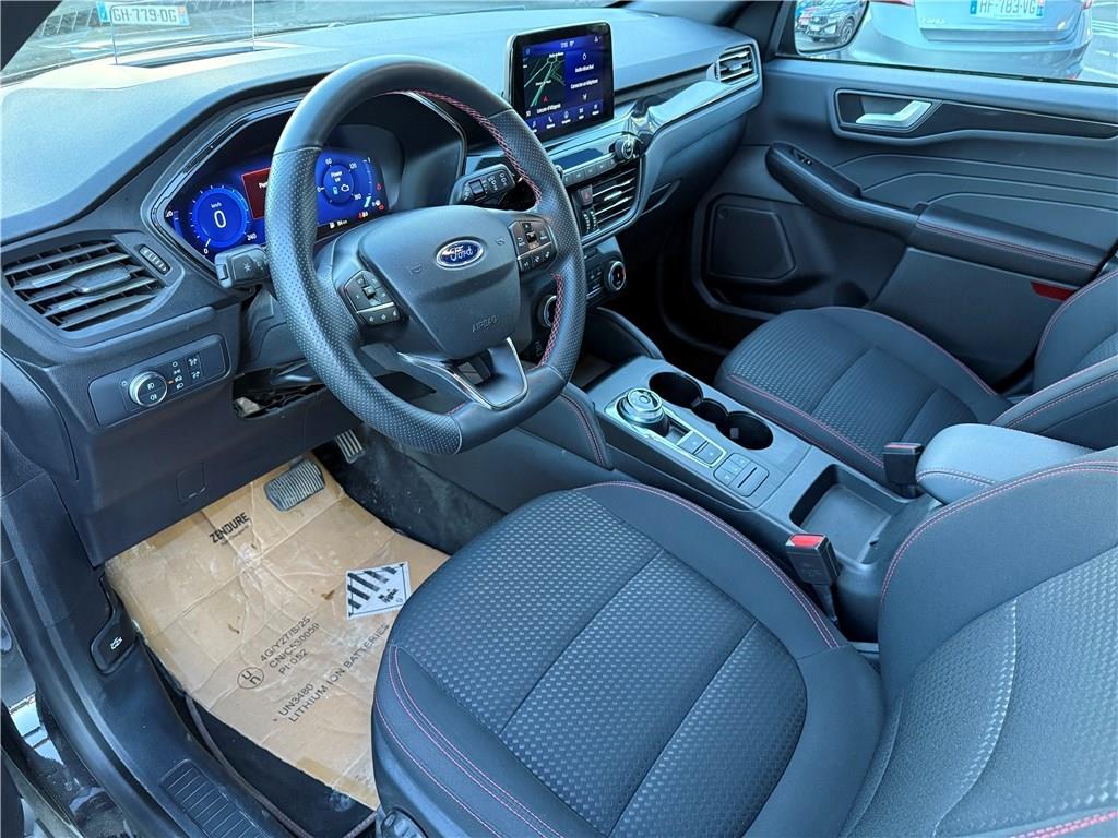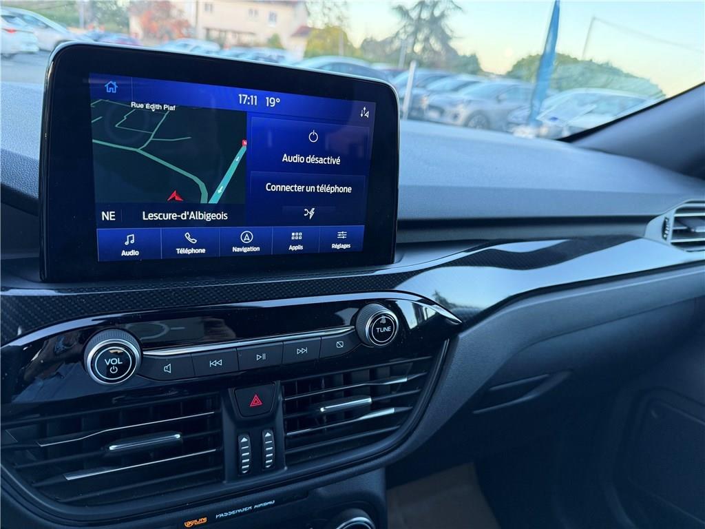 2 Fixations ISOFIX aux places AR|3ème appui-tête AR|5 ceintures de sécurité 3 points|Aide au démarrage en côte|Aide au maintien dans la voie avec avertisseur de franchissement de ligne|Aide au stationnement AV/AR|Airbags frontaux, latéraux (thorax) et rideaux|Air conditionné automatique bizone|Allumage automatique des essuie-glaces|Allumage automatique des feux|Badge ST-Line|Banquette AR coulissante rabattable (60/40)|Barres de toit Noir|Becquet AR couleur carrosserie|Bouton de démarrage "Ford Power"|Caméra AR 180°|Combiné d'instrumentalisation numérique 12.3" avec Ecomode|Console centrale avec accoudoir avec 2 prises USB|Contours de vitres noirs|Correcteur électronique de trajectoire (ESP) avec optimisation du freinage électronique|Crochet d'attelage amovible|Désactivation de l'airbag passager|Déverrouillage électrique du hayon|Disques de frein AR|Double sortie d'échappement ST-Line|Eclairage compartiment coffre|Eclairage d'ambiance intérieur|Environnement noir|E-shifter (le sélecteur de vitesses rotatif électronique)|Feux de jour AV et AR à LED|FordPass Connect avec modem embarqué 4 et fonction eCall|Frein de stationnement électrique|Grille de calandre ST-Line|Jantes alliage 18" 5x2 branches finition St-Line avec pneus 225/60 R18|Kit Carrosserie ST-Line|Kit de réparation des pneumatiques|Logo ST-Line sur les ailes gauche et droite|Pack Design Sport|Pack Techno|Peinture métallisée Noir Agate|Phares antibrouillard AV LED|Phares halogènes|Plancher de coffre ajustable|Prise 12V dans le coffre|Régulateur de vitesse|Rétroviseur intérieur électrochrome|Rétroviseurs extérieurs couleur carrosserie électriques, chauffants et rabattables avec éclairage|Roue de secours galette 17" avec pneus 165/70R17|Sécurité enfant (verrouillage manuel des portes AR)|Sellerie tissu noir Foundry avec renforts latéraux Eton|Siège conducteur réglable en hauteur avec soutien lombaire (8 positions)|Siège passager réglable en hauteur avec soutien lombaire (8 positions)|Sièges sport|Suspension ST-Line|Système audio bi-tuner AM/FM Ford SYNC4, avec écran tactile 8", DAB, commandes vocales, 2 ports USB,|Système d'avertissement acoustique (AVAS - Alerte sonore pour piétons)|Système de navigation Europe et points d'intérêts Michelin|Système de prévention de collision avec détection de piétons|Système de surveillance de la pression des pneus|Système KeyFree avec ouverture et démarrage sans clé|Système MyKey (seconde clé programmable)|Tapis de sol AV et AR ST-Line avec surpiqûres rouges|Trappe Easy Fuel|Verrouillage centralisé à distance|Vitres AR surteintées|Vitres AV et AR électriques|Volant à méplat 3 branches Sensico ST-Line avec surpiqûres rouges
