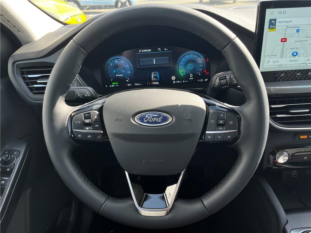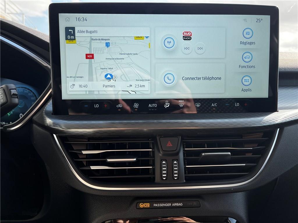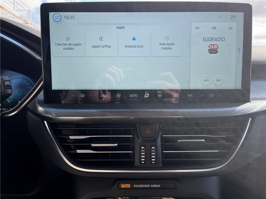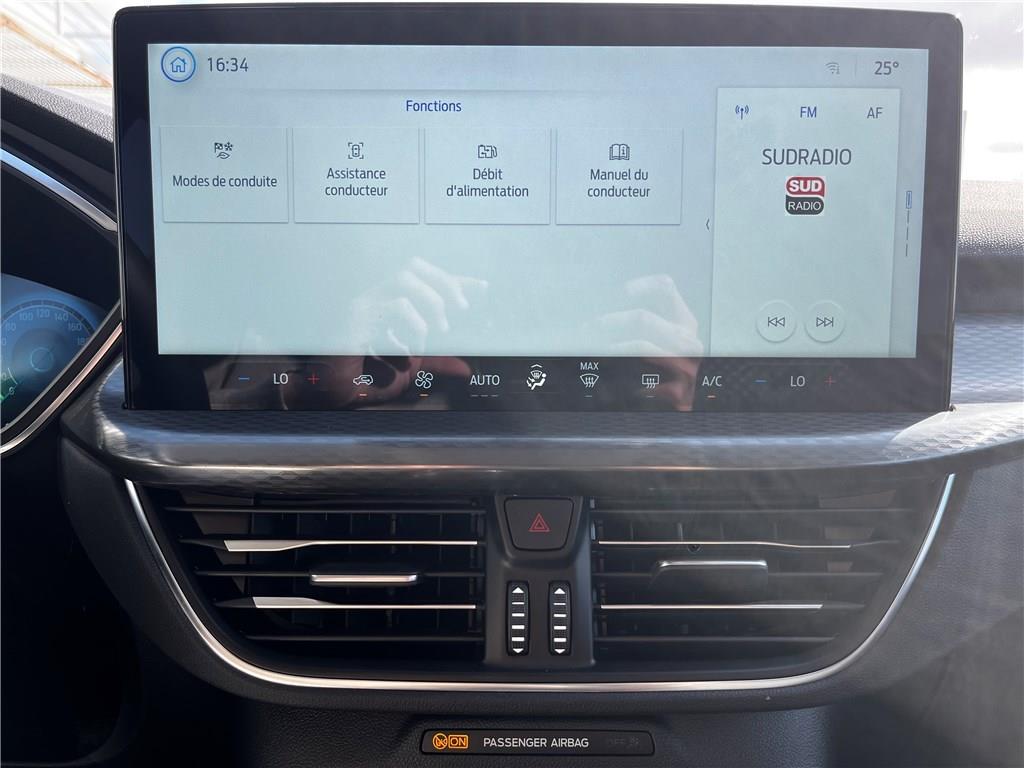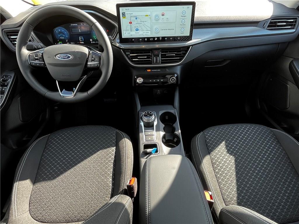 2 ports USB à l'AR (type C)|4 Modes de conduite sélectionnables: Normal, Eco, Sport, Faible adhérence|ABS|Aide au maintien dans la voie|Aide au stationnement AV/AR|Airbags frontaux, latéraux et rideaux|Air conditionné automatique bizone|Alerte de véhicule en approche avec assistance au freinage d'urgence|Allumage automatique des essuie-glaces|Antibrouillard AV|Anti démarrage Securilock|Applications décoratives spécifiques Titanium|Assistance prédictive de limitation de vitesse|Banquette AR ajustable et rabattable 60/40|Barres de grille de calandre inférieure|Barres de toit en aluminium|Barres de toit noires|Batterie d'hybridation éléctrique|Becquet AR|Boîte automate à fonction continu|Bouclier AR avec inserts teintés dans la masse|Bouclier AR couleur carrosserie|Bouclier AV avec inserts noirs|Bouclier AV partiellement peint couleur carosserie|Caméra AR 180°|Chargeur sans fil|Ciel de toit beige|Combiné d'instrumentalisation numérique 12.3" avec Ecomode|Combiné d'instrumentalisation numérique avancée 12.3" avec Ecomode|Console centrale avec accoudoir avec 2 prises USB|Contour de vitre brillant|Coques de rétroviseurs peints couleur carrosserie|Direction assistée|Double sortie d'échappement|eCALL (bouton d'appel d'urgence)|Eclairage d'ambiance intérieur|E-Shifter - Sélecteur de vitesse rotatif|ESP|Feux de route intelligents (commutation automatique des feux de route/croisements)|Frein de stationnement électrique|Grille de calandre chromée Titanium|Jantes alliage 17" Titanium|Kit de réparation des pneumatiques|Limiteur de vitesse intelligent|Modem 5G|Ordinateur de bord|Panneaux inférieurs de protection de porte peintes|Peinture métallisée Vert Bursting|Peinture non métallisée Blanc Glacier|Phares AV avec fonction Follow me home|Phares Full LED avec feux de jour à LED|Plancher de coffre ajustable|Poignée de coffre couleur carrosserie|Poignées de porte couleur carrosserie|Prise 12V dans le coffre|Reconnaissance des panneaux de signalisation|Régulateur de vitesse|Rétroviseur intérieur électrochrome|Rétroviseurs extérieurs électriques chauffants, rabattables électriquement avec éclairage d'approche|Sans accoudoir central AR|Sécurité enfant (verrouillage manuel des portes AR)|Sellerie en tissu Kylo et Eton avec surpiqûres grises|Siège conducteur à réglage manuel sur 8 voies|Siège conducteur et passager avec pôche aumonière|Siège passager à réglage manuel sur 8 voies|Sièges Sport|Surveillance des angles morts avec assistance au remorquage|Suspension AR barre de torsion|Suspensions standards|SYNC 4 avec écran 13,2'', 6 HP avec radio DAB, Apple Carplay et Android auto sans fil|SYNC 4 avec écran 13,2'', 6 HP avec radio DAB, Apple Carplay et Android auto sans fil|Système d'alerte à la conduite à contre-sens|Système de prévention de collision avec détection de piétons|Système de surveillance de la pression des pneus|Système Keyfree avec ouverture des portes AV et démarrage sans clé|Tapis de sol AR velours|Tapis de sol AV et AR en velours|TCS|Vitres AR surteintées|Vitres AV et AR électriques|Volant 3 branches Sensico|Volant 3 branches Sensico avec insert noir brillant
