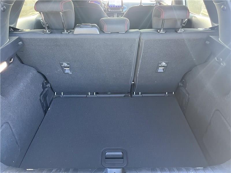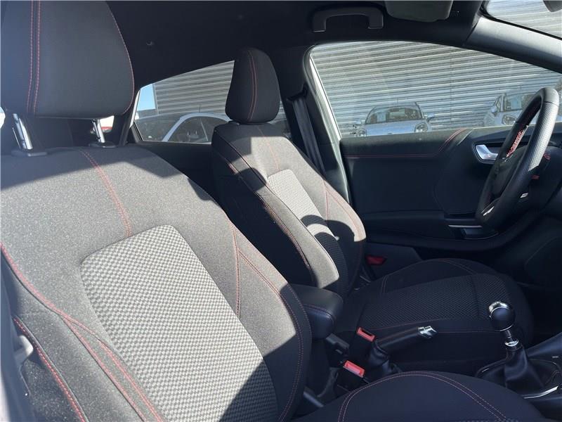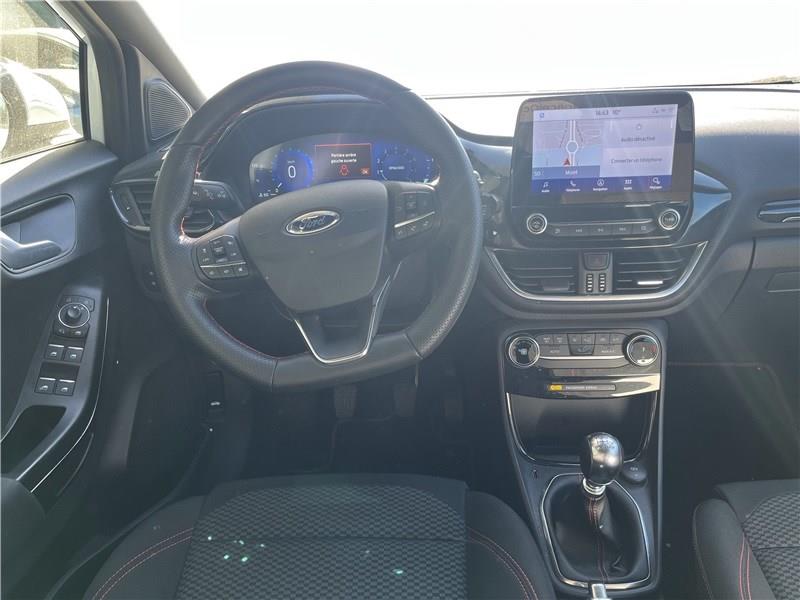 2 Fixations ISOFIX aux places AR|3ème appui-tête AR|5 ceintures de sécurité 3 points|5 Modes de conduite sélectionnables (normal, eco, sport, faible adhérence, trail)|Aide au démarrage en côte|Aide au maintien dans la voie avec détection des bas-côtés|Aide au stationnement AR|Airbags frontaux, latéraux (thorax) et rideaux|Air conditionné manuel|Alerte de ceinture de sécurité AV/AR|Alerte de franchissement involontaire de ligne|Allumage automatique des feux|Badges extérieurs ST-Line|Banquette AR rabattable 60/40|Becquet couleur carrosserie|Bouton de démarrage "Ford Power"|Combiné d'instrumentation numérique 12.3" avec Ecomode|Console centrale avec accoudoir et rangements|Correcteur électronique de trajectoire (ESP)|Désactivation de l'airbag passager|Direction assistée électrique|Disques de frein AV|Eclairage d'ambiance intérieur|Environnement noir|Feux AR à LED|Feux de jour à LED|Feux de route intelligents - Commutation automatique des feux de route aux feux de croisement|FordPass Connect avec modem embarqué et fonction E-Call|Grille de calandre ST-Line|Hayon électrique mains libres|Jantes alliage 17" 5x2 branches finition Black Machined (pour pneus toutes saisons 215/55 R17)|Kit de carrosserie ST-Line|Kit de réparation pneumatique|Levier de frein à main Sensico|Levier de vitesse Sensico|Limiteur de vitesse intelligent (affichage instantané des limitations de vitesse sur le tableau de bord)|Navigation avec Système audio Ford SYNC3 avec écran tactile 8", commandes vocales, 2 ports USB, alerte contresens, compatible AppLink, Apple CarPlay et Android auto, 6 hauts-parleurs|Pack Confort|Pack Sécurité Intégrale|Peinture non métallisée Blanc Glacier|Phares antibrouillard AV avec fonction éclairage des angles|Reconnaissance des panneaux de signalisation|Régulateur de vitesse|Rétroviseurs extérieurs couleur carrosserie électriques, dégivrants et rabattables électriquement avec éclairage d'approche|Sellerie tissu noir Court avec surpiqûres rouges|Siège conducteur a réglage manuelle en hauteur avec soutien lombaire|Sortie d'echappement chromée|Suspension Sport|Système de prévention de collision avec freinage post-collision et détection piétons|Système de surveillance de la pression des pneus|Système MyKey (seconde clé programmable)|Tapis de sol AV avec surpiqûres|Trappe Easy Fuel|Vitres AR surteintées|Vitres AV/AR électriques à impulsion haut/bas|Volant à méplat 3 branches ST-Line avec surpiqûres rouges